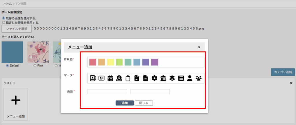 - 「背景色」「マーク」「画面」にて、それぞれ任意のものを選択し、「追加」ボタンをクリックします。