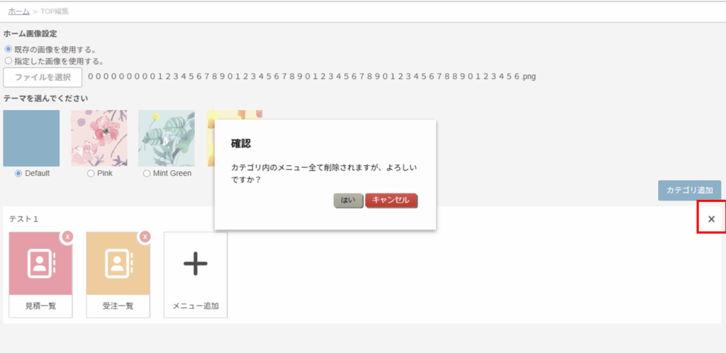 ただし、カテゴリに画面が設定されている状態で、カテゴリごと削除する場合は確認メッセージが表示されますのでご確認ください。