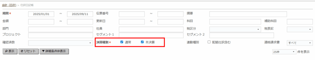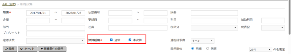 「本決算」のみにチェックが入った場合は、決算仕訳のみが表示されます。