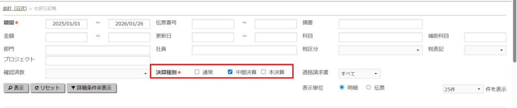 2. 「期間」を中間決算仕訳の日付を含めた日付にします。