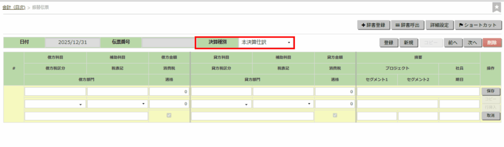 ※「決算種別」で、「通常」のみにチェックが入った場合は、通常仕訳のみ。