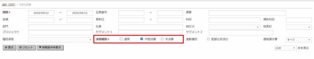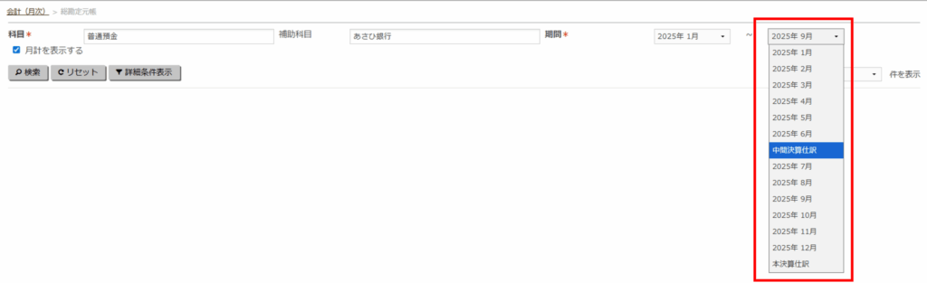 - 「期間」を中間決算仕訳の日付を含めた日付にします。