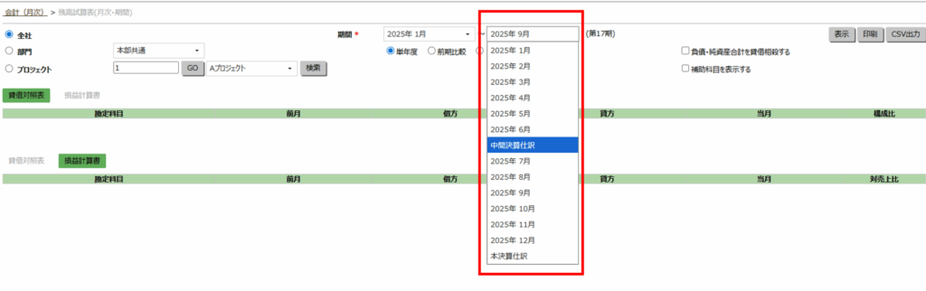 集計>「中間決算」は、会計基本情報の設定問わず、選択項目が表示されます。