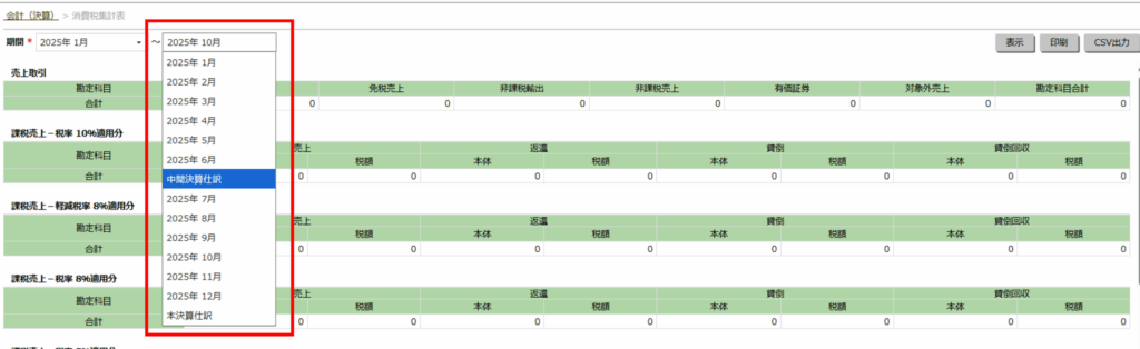 期間を、2025年4月~2025年10月31日で表示させると、中間決算仕訳の入力内容も含まれます、ご注意ください。