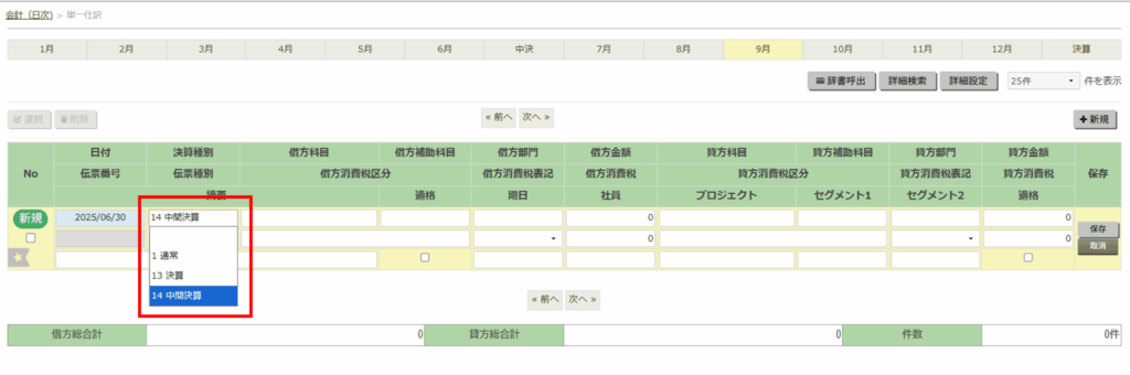 - 「決算種別」にて、「中間決算仕訳」が追加されていますので、中間決算仕訳を入力したい場合は、決算種別で中間決算仕訳を選択して、仕訳入力を行ってください。