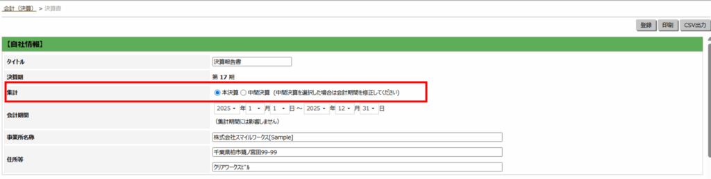 - 「集計」にて、(本決算)または(中間決算)を選択してください。