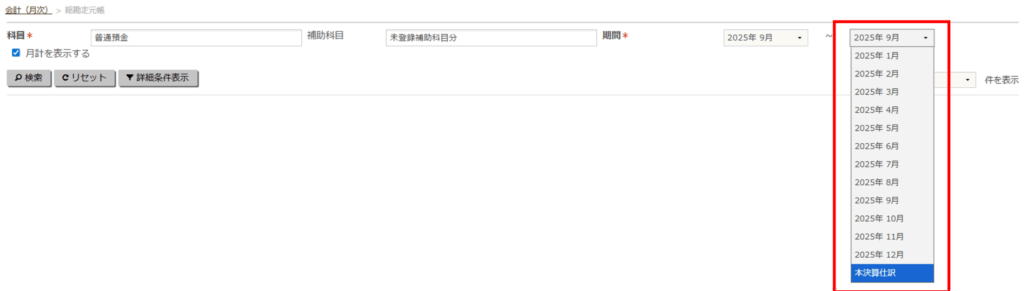 - 「期間」で本決算仕訳を選択して、「検索」をクリックします。