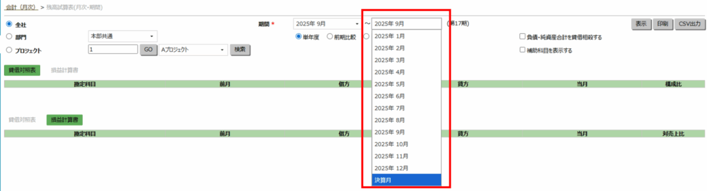- 「会計」>「月次」>残高試算表「月次・期間」にアクセスします。