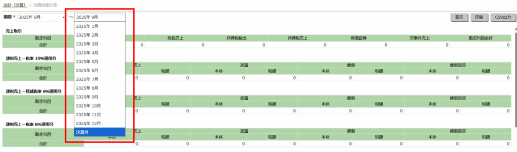 - 「会計」>「決算」>「消費税集計表」にアクセスします。