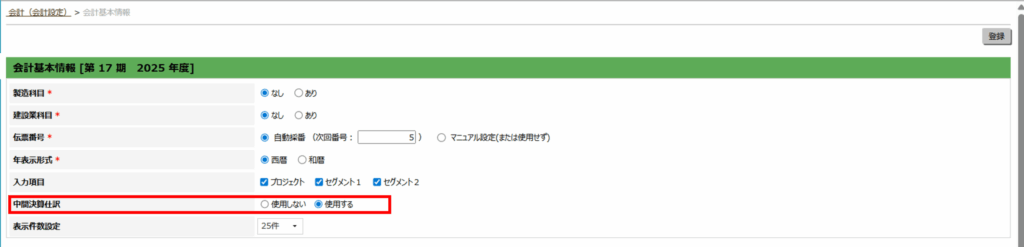 - 「会計基本情報」>「中間決算仕訳」にて、(使用する)を選択し、「登録」をクリックします。