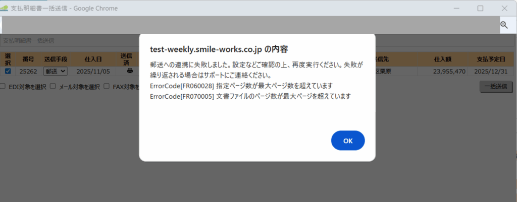 8枚以上請求書(支払明細書)の送信を行うとエラーが表示されます。