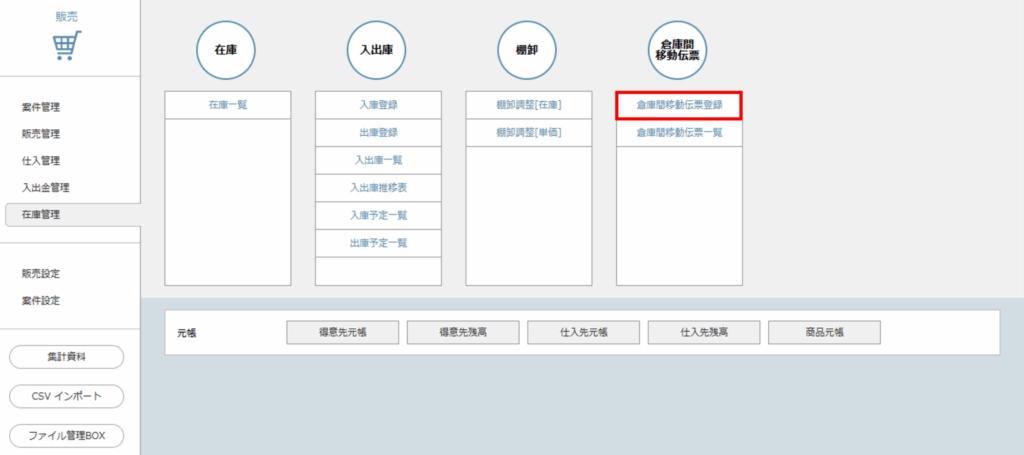 - 「販売」>「在庫管理」>「倉庫間移動伝票登録」にアクセスします。
