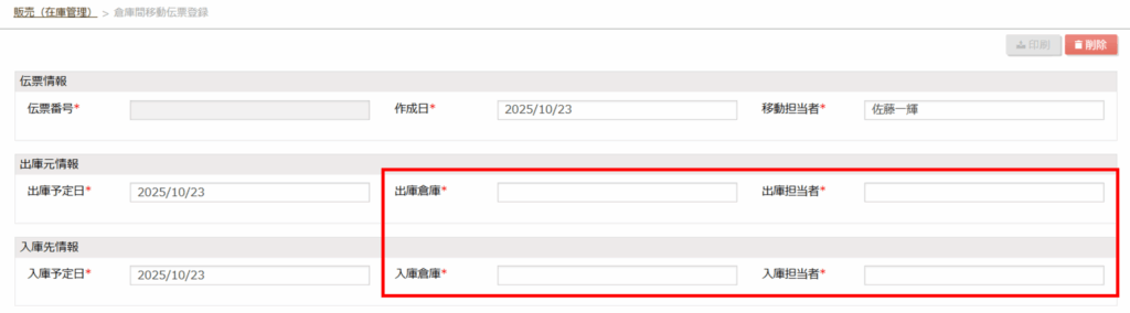 - 「伝票情報」「出庫元情報」「入庫先情報」の倉庫と担当者を選択します。
