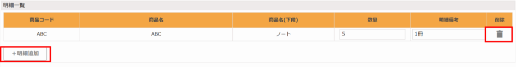 - 「+明細追加」をクリックし、商品検索から該当の商品を追加します。