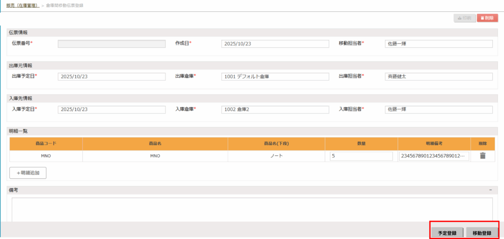 倉庫間移動伝票登録を「予定登録」し、出庫登録と入庫登録を実施した状態