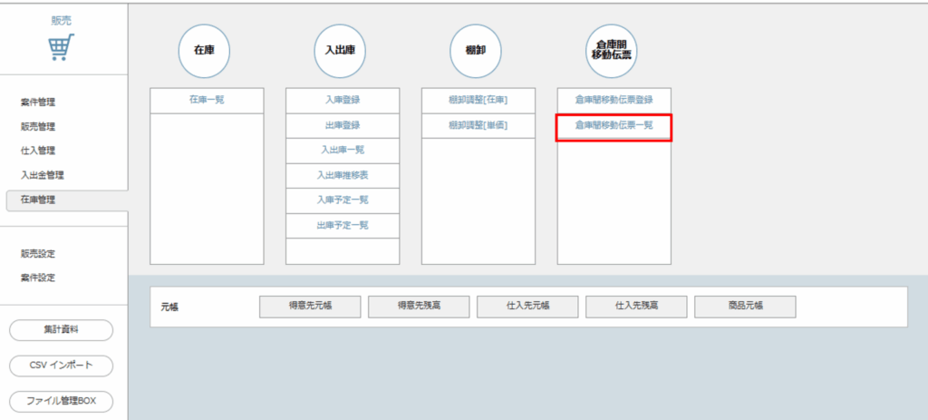 - 「販売」>「在庫管理」>「倉庫間移動伝票一覧」にアクセスします。