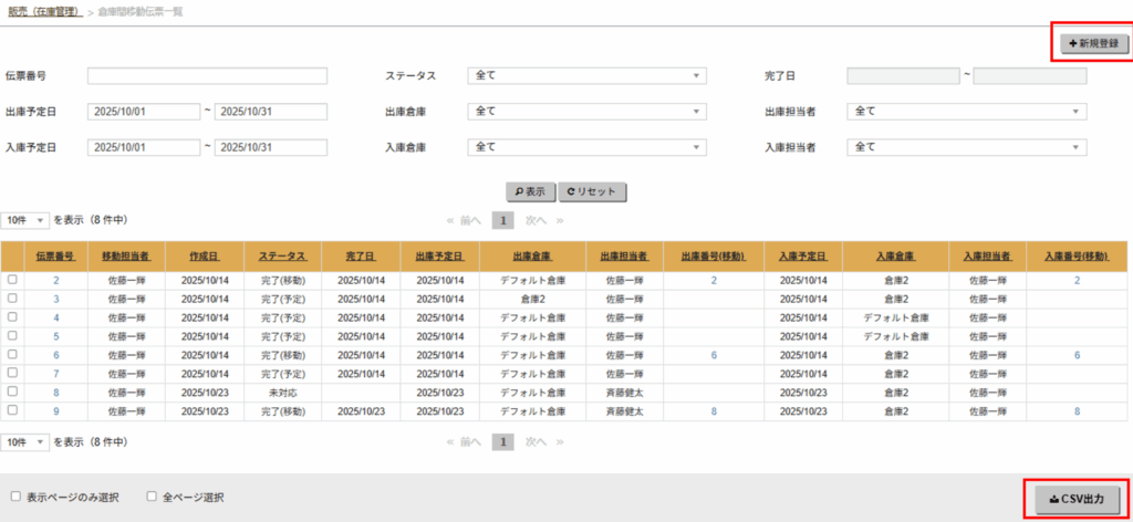 倉庫間移動伝票登録後、「出庫予定一覧」から出庫登録を実施、その後に「入庫予定一覧」で入庫登録を行う必要があります。