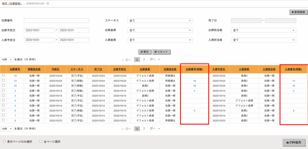 - 該当の「出庫番号(移動)」または「入庫番号(移動)」をクリックしてください。