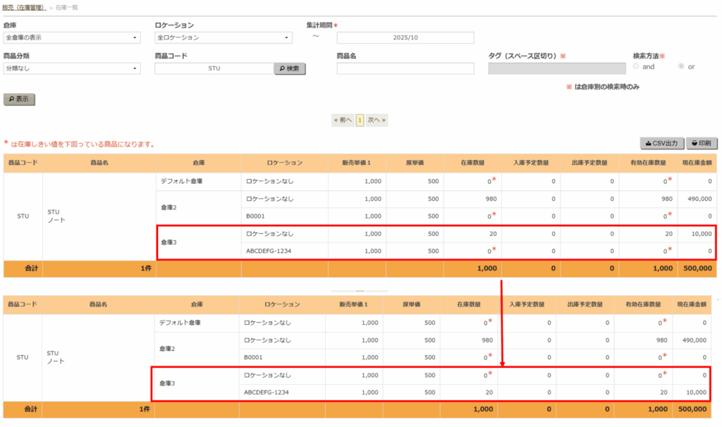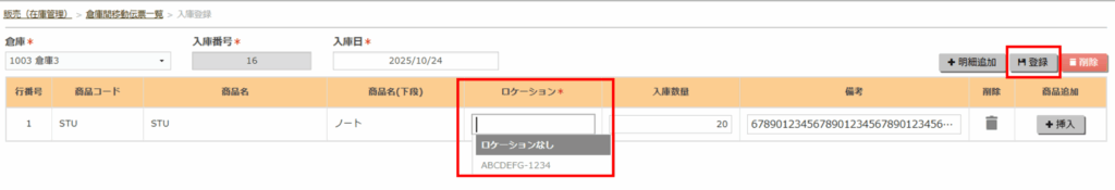 登録後、在庫一覧のロケーションの数量が変わります。