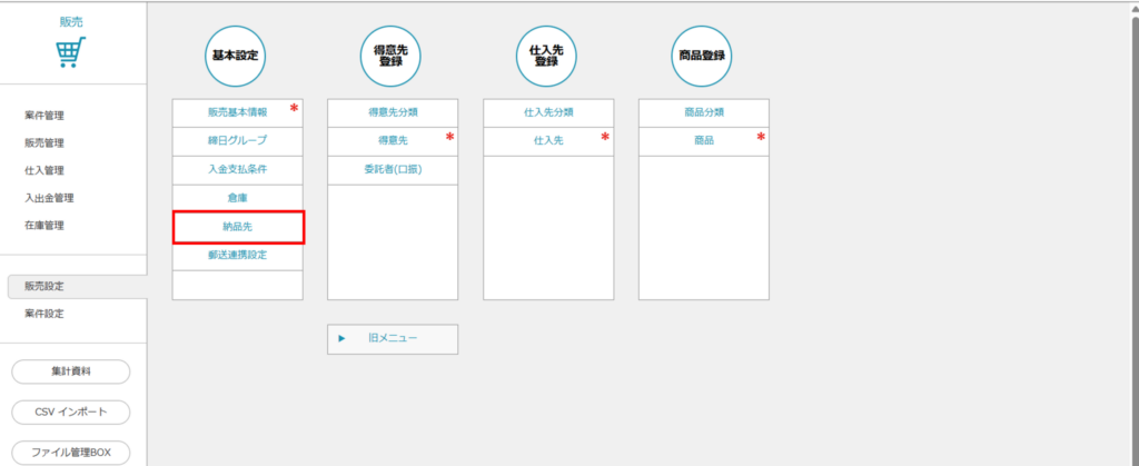 - 「販売」>「販売設定」>「納品先」にアクセスしてください。