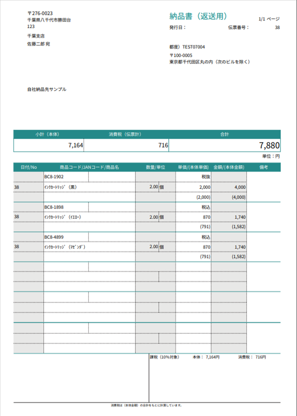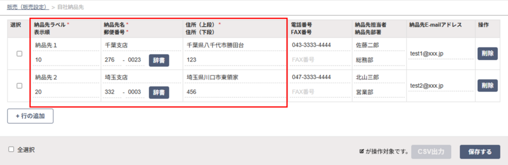 ※登録した自社納品先情報は、「納品書(返送用)」に反映します。