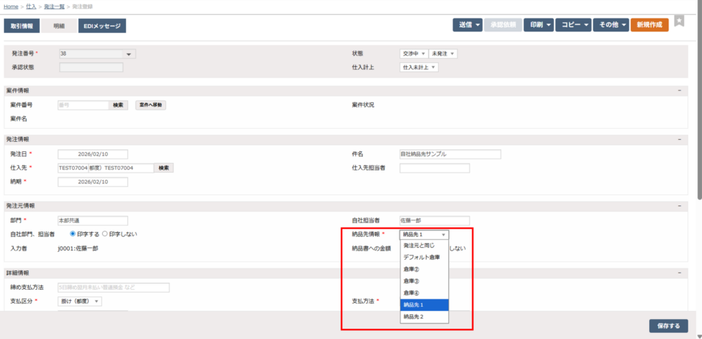 - 入力した内容は、「販売」>「仕入管理」>「発注登録」>納品先情報にリストとして追加されます。