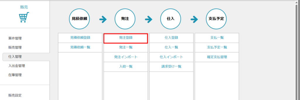 - 「販売」>「仕入管理」>「発注登録」にアクセスします。