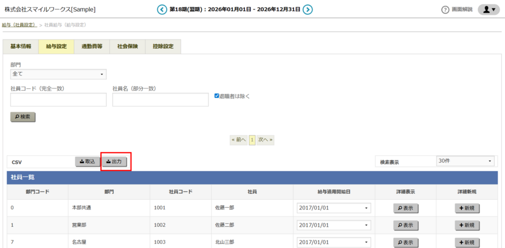 給与の各設定で、CSVインポートによる登録が可能な場合は、画面に表示される一覧の上に、CSV「取込」「出力」ボタンが表示されます。