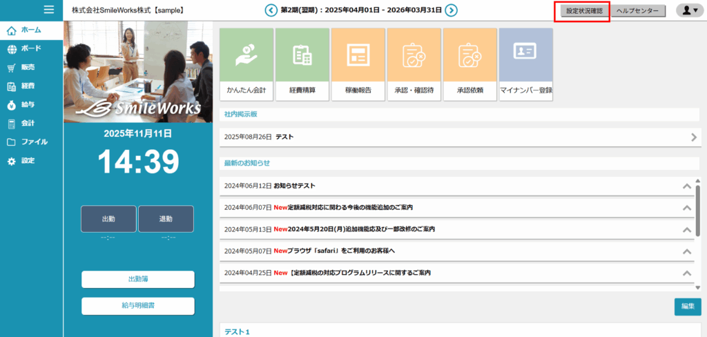 販売ERPをご契約のお客様は、ホーム右上にあります「設定状況確認」をクリックすると設定状況のウィザード画面が表示されます。