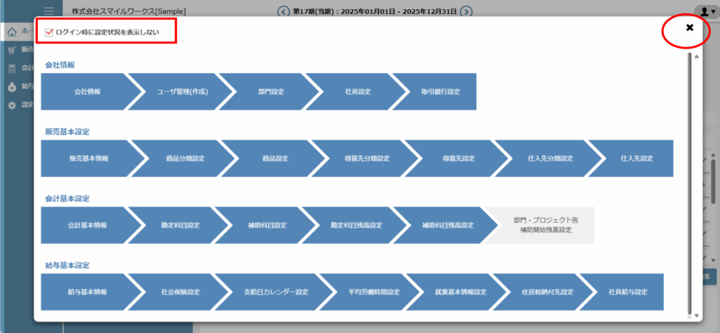 設定状況のウィザード画面の表示を必要としない場合は、左上の「ログイン時に設定状況を表示しない」にチェックを入れて、右の ×(バツ)ボタンをクリックしてください。