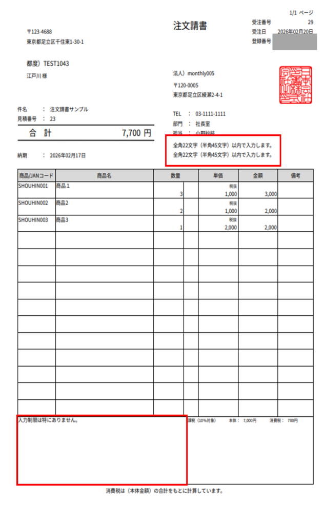 「販売基本情報」>「販売印刷設定」で注文請書のコメント(上段・下段)、フッターに任意の文字列を登録すると、赤枠箇所の通り、すべての注文請書に印字します。