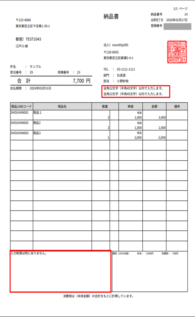 (納品書には、2行帳票を設定した場合のみ支払期日が表示されます、3行帳票設定時は表示されません。)