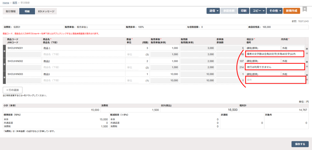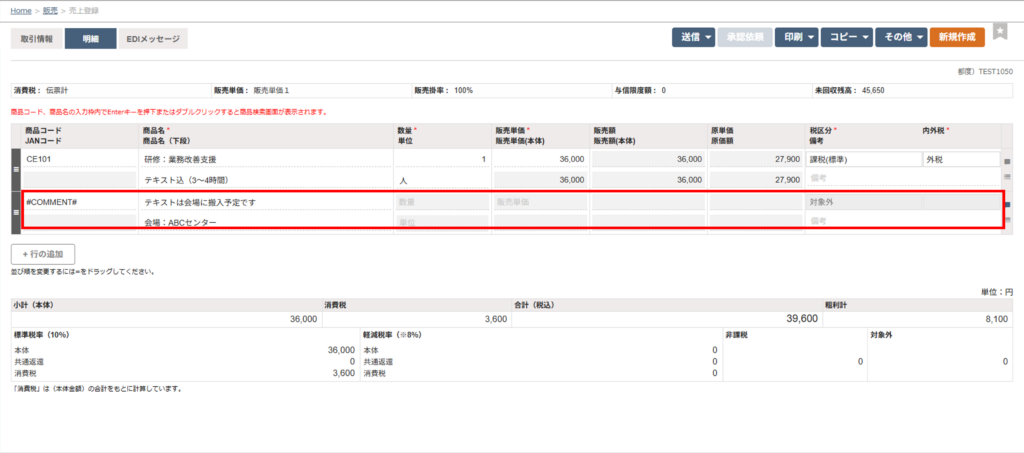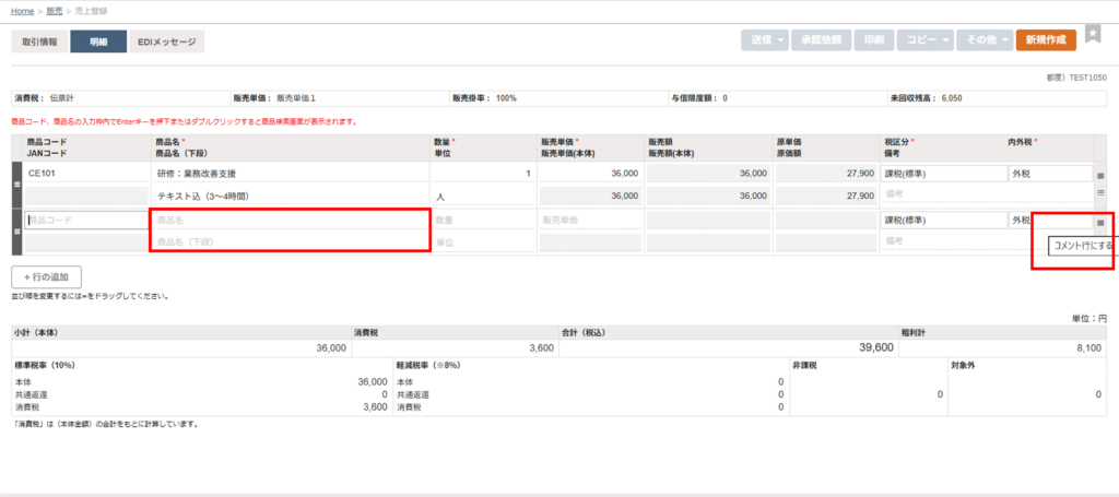 商品明細行の商品名の部分を使用する「商品コメント行」機能
