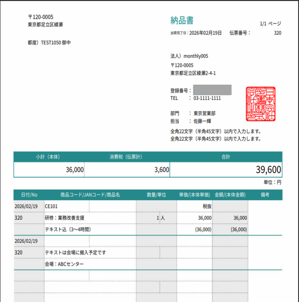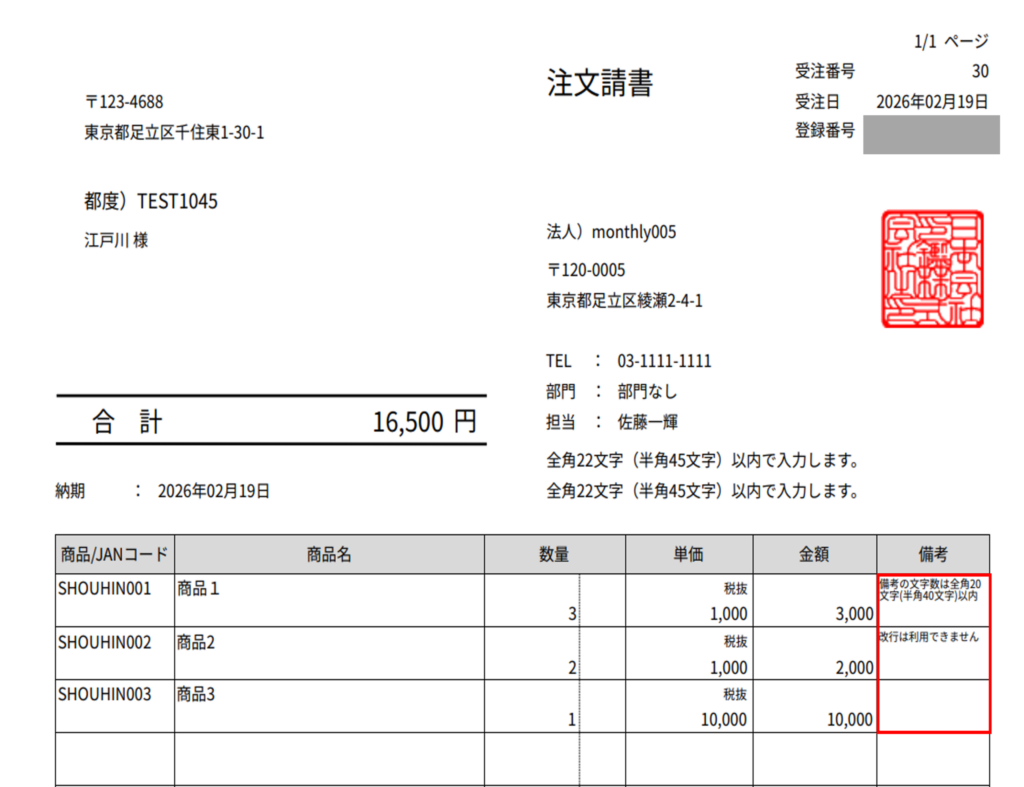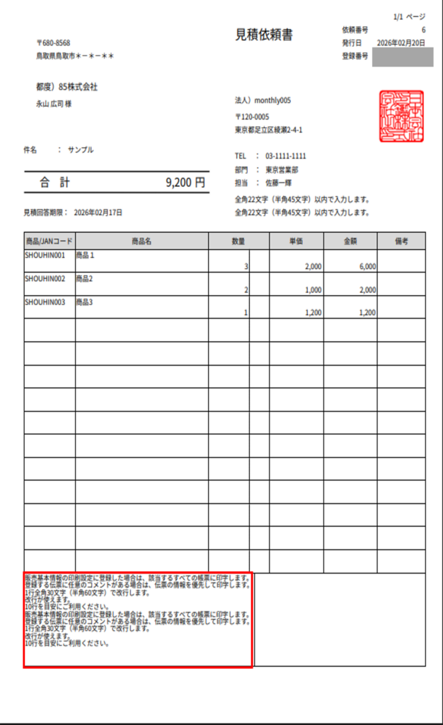 - 登録する伝票に任意のコメントがある場合は、伝票の情報を優先して印字します。
