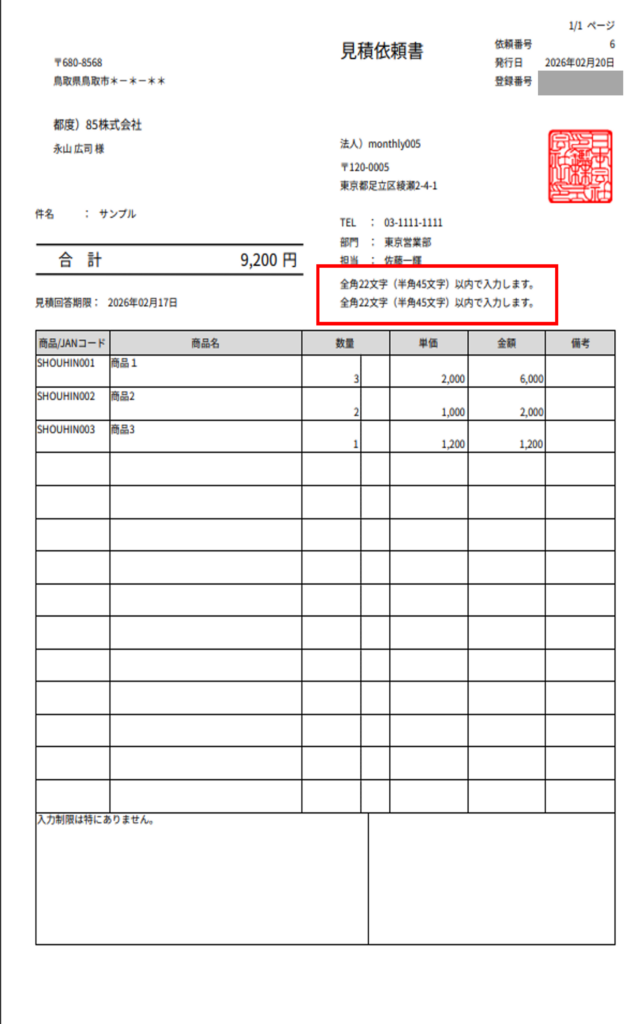 帳票に任意のコメント等が印字できる場所は次の通りです。