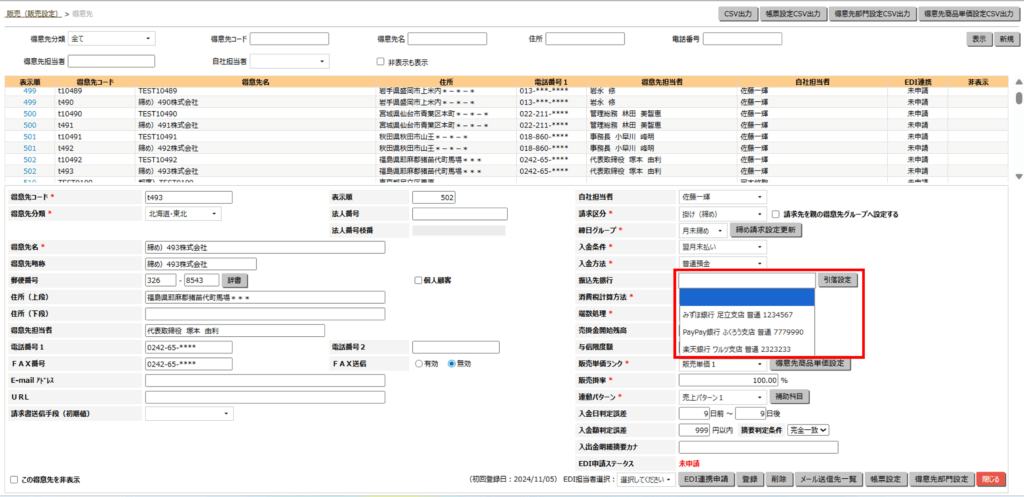- 「販売設定」>「得意先」で、振込先銀行を設定します。