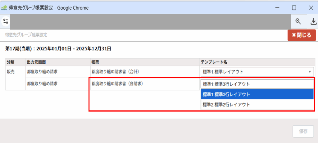 帳票設定ボタンをクリックすると、「得意先グループ帳票設定」画面が開き、該当の得意先グループ限定で「都度取り纏め請求書(各請求書)」のテンプレートを切り替えることができます。