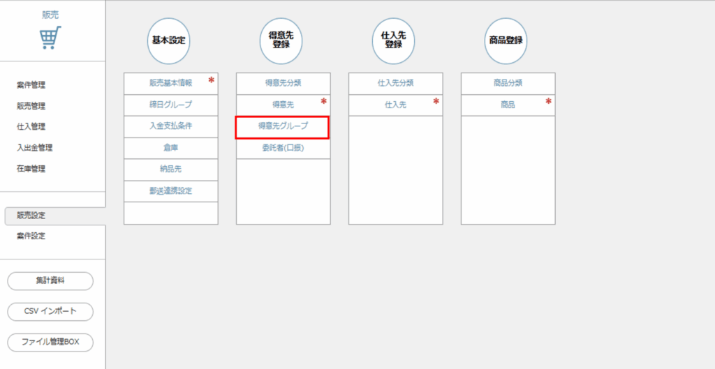 - 画面左上のタブで「得意先グループ設定」にあわせます。