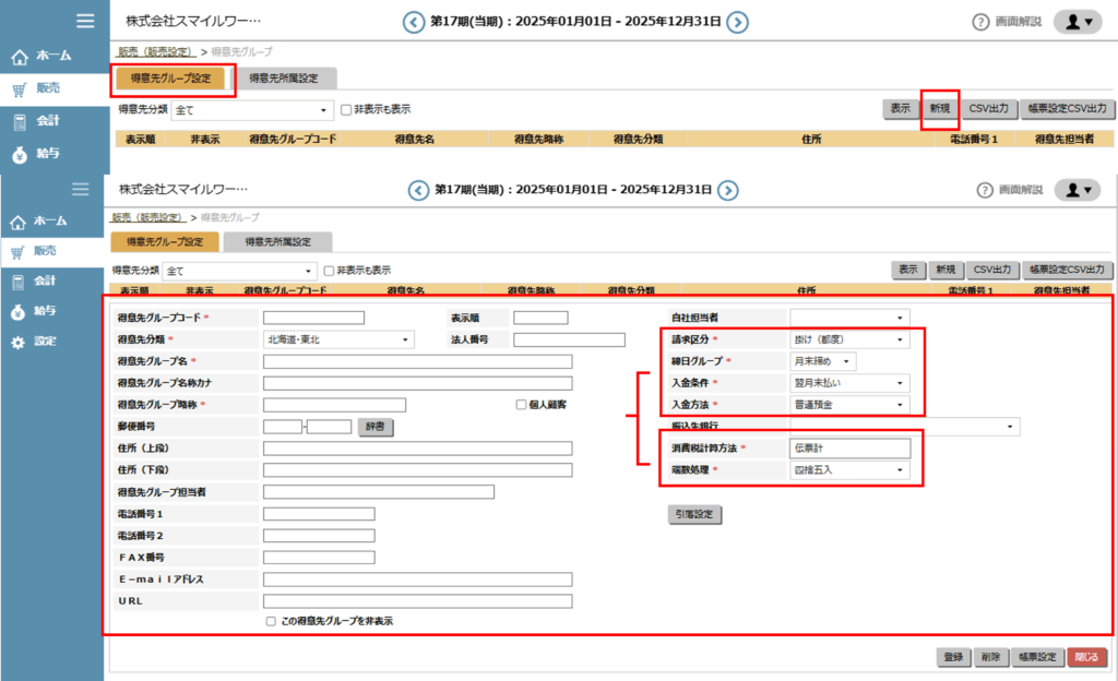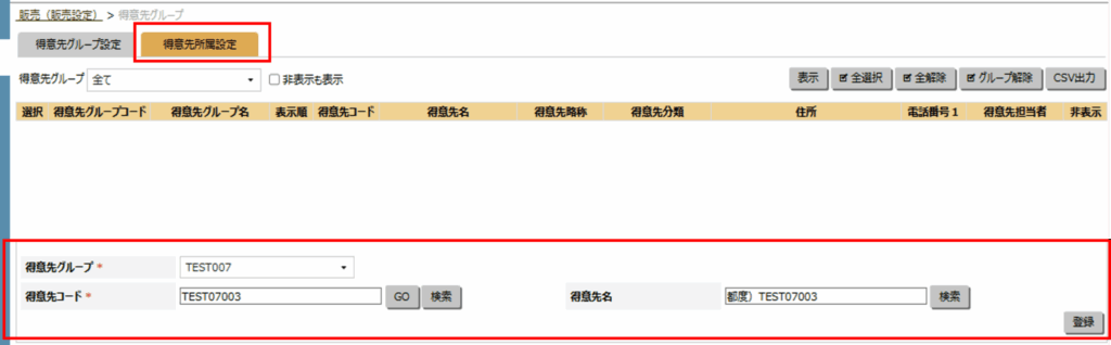 得意先と得意先グループで、設定内容を揃える部分にご注意ください。 - 得意先と得意先グループの登録が完了したら、得意先グループ画面の左上のタブで「得意先所属設定」にあわせます。