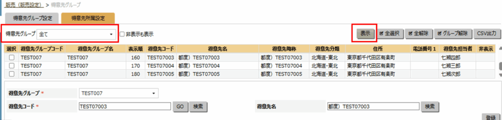- 得意先所属設定をした情報を一覧で確認する時は、画面上部のプルダウンで得意先グループを選択し、「表示」ボタンをクリックします。