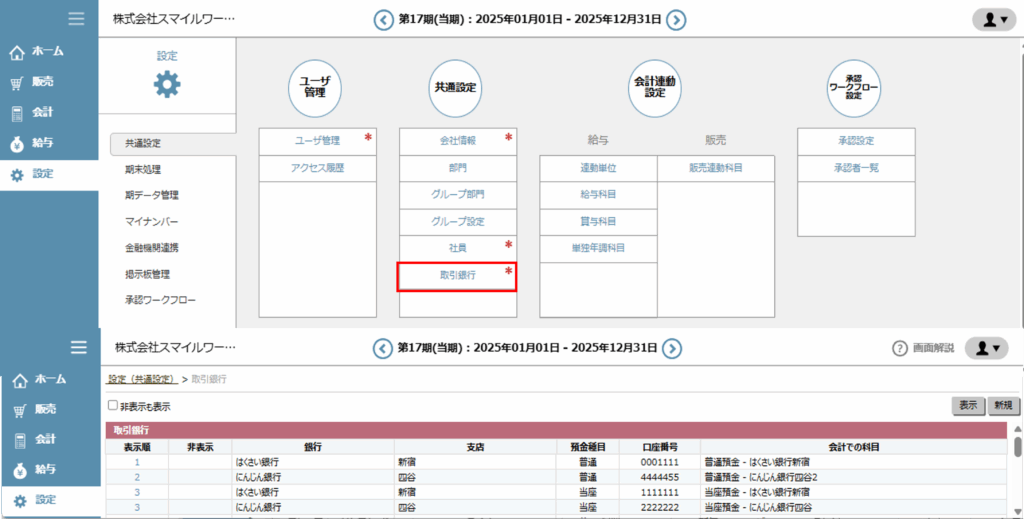 - 「設定」>「共通設定」>「取引銀行」に自社の金融機関口座の情報を登録します。