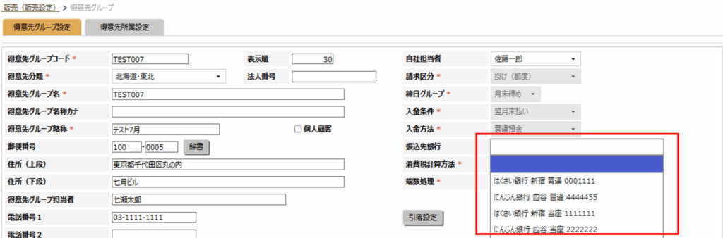 - 「販売設定」>「得意先グループ」で、振込先銀行を設定します。