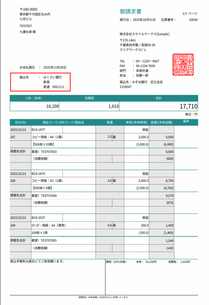 ここで設定した口座情報が、この得意先グループへの「請求書」に印字されます。