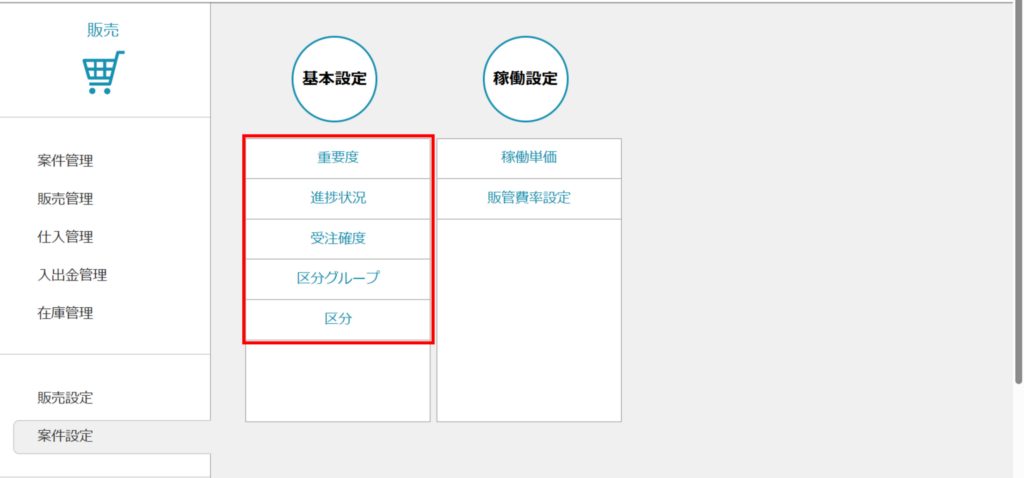 案件設定は、プロジェクト(案件)をどのように利用していくのかの各種設定を行います。