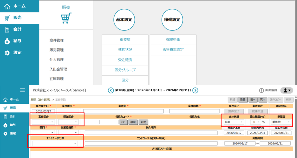 ・「基本設定」>「区分」>案件登録画面の案件登録画面の「案件区分」「受託区分」「エンドユーザー分類」の
