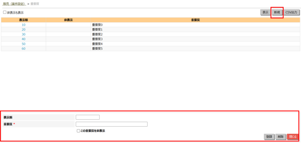 ・「基本設定」>「重要度」>案件登録画面「重要度」に反映します。