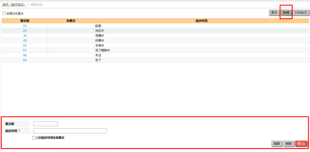 初期値では、起案・対応中・見積中・折衝中・手続中・失注・完了をご用意しています。