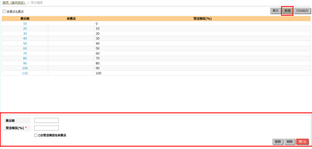 ・「基本設定」>「受注確度」>案件登録画面「受注確度」に反映します。