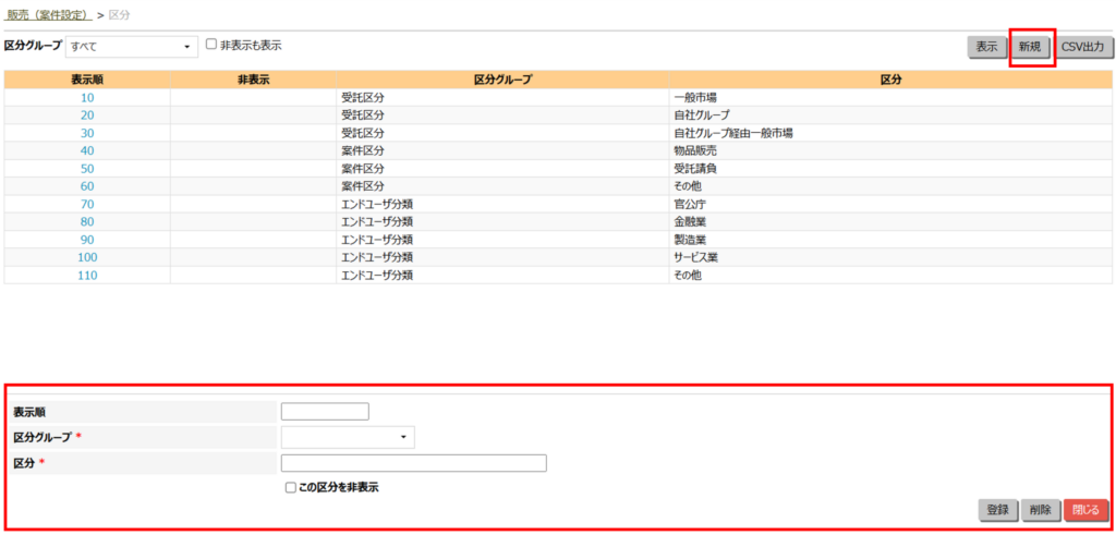 ・「基本設定」>「区分グループ」>案件登録画面の「案件区分」「受託区分」「エンドユーザー分類」の