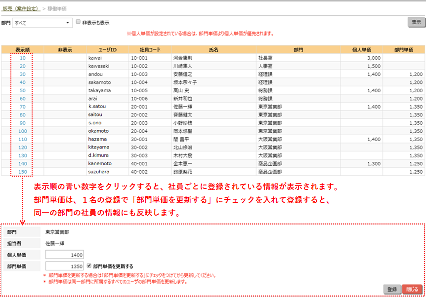 「個人単価」を設定した場合は、「部門単価」の登録があっても「個人単価」が優先されます。